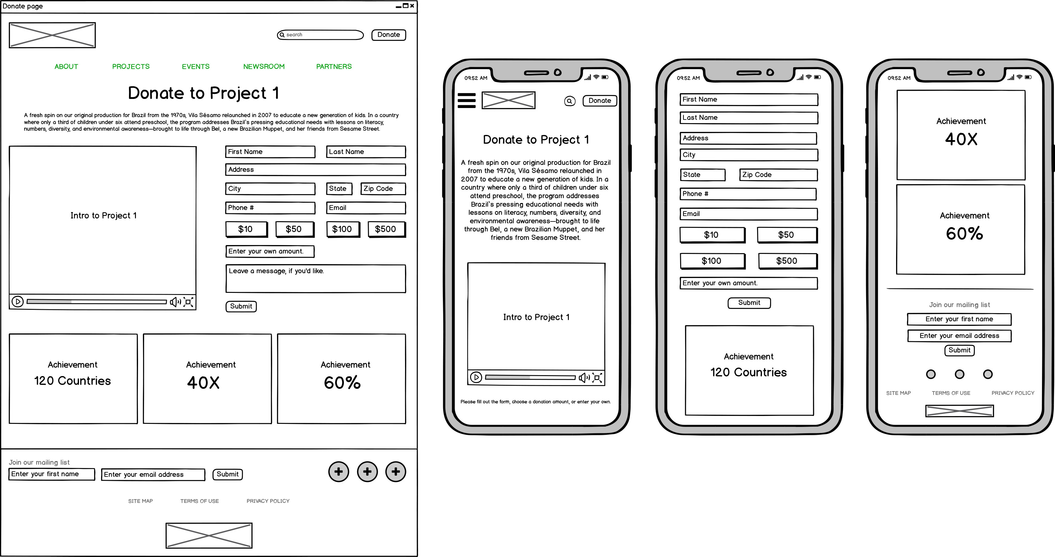 We created low-fidelity prototypes for both desktop and mobile of SesameWorkshop.org with paper, whiteboard and Balsamiq, focusing on the user flow of donation.